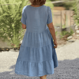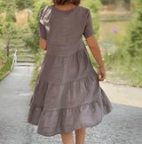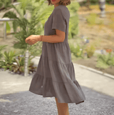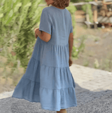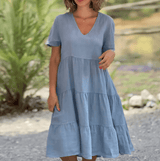 Erleben Sie ein trapezförmiges Kleid, das für Komfort und Stil entworfen wurde. Hergestellt aus leichtem, atmungsaktivem Stoff, hält dieses knielange Kleid Sie an warmen Tagen kühl und angenehm. Sein V-förmiger Ausschnitt, die Lagen-Details und der ausgestellte Schnitt erzeugen eine schmeichelhafte Silhouette, die eine natürliche feminine Form betont. Erhältlich in Braun, Blau und Rosa sowie in den Größen S bis 3XL, passt dieses Kleid sowohl für lässige Ausflüge als auch elegante Anlässe. Kombinieren Sie es mit Sandalen oder Sneakers für einen entspannten Look oder stylen Sie es mit High Heels und Accessoires für einen eleganten Auftritt.