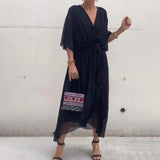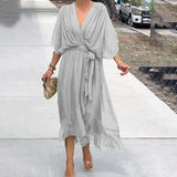 Vielseitiger Stil: Der feminine V-Ausschnitt und die fließende Passform machen das Kleid zu einem Allrounder – für Alltag und besondere Momente.