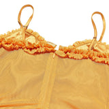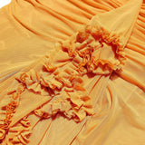 Entdecken Sie das Apricot-Rüschenkleid, das Eleganz und Drama verbindet