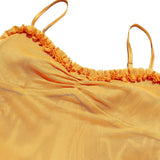Dieses apricotfarbene Kleid besticht durch eine auffällige Rüschenfront und ein vom Vintage-Stil inspiriertes Design. Die Silhouette ist an der Hüfte gerafft und fließt in eine Wasserfall-Rüsche sowie einen eleganten, langen Zug über. Für Komfort und Weiblichkeit konzipiert, verfügt es über einen Reißverschluss am Rücken für eine perfekte Passform und lässt sich toll mit High Heels kombinieren. Ideal für romantische Abende, formelle Dinner, Abschlussbälle, Hochzeiten und besondere Anlässe – es vereint Stil mit Tragekomfort. Hergestellt aus sehr dehnbarem Stoff, fällt es größengerecht aus. Für besseren Halt passt ein tief ausgeschnittener, trägerloser BH dazu. Nur chemisch reinigen.