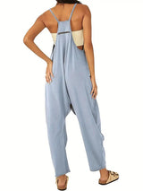 Erleben Sie einen bequemen und modernen Look mit diesem klassischen ärmellosen Jumpsuit. Gefertigt aus einer atmungsaktiven Mischung aus 50 % Baumwolle und 50 % Polyester, verfügt er über eine lockere Passform und einen schmeichelhaften V-Ausschnitt. Das Design mit weitem Bein umfasst zwei große Fronttaschen und eine Reißverschlusstasche auf der Rückseite für praktische Aufbewahrung. Maschinenwaschbar und in verschiedenen Größen erhältlich, passt sich dieser Jumpsuit mühelos unterschiedlichen Körpertypen und Jahreszeiten an.