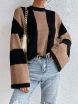 Hüllen Sie sich in gemütliche Eleganz mit diesem gestrickten zweifarbigen Pullover, der fließende weite Ärmel und eine entspannte Passform bietet. Seine weiche Silhouette verleiht eine mühelose Schicht aus Wärme und Stil, ideal für frische Morgen, Büroausflüge oder Wochenendspaziergänge.