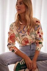 Genieße mühelosen Stil mit dieser langärmligen Bluse, die mit einem auffälligen, kunstvollen Muster verziert ist und jedes Stück zu etwas Besonderem macht. Aus weicher, atmungsaktiver Baumwolle gefertigt, bringt sie entspannten Komfort in deine Alltagsgarderobe. Kombiniere sie mit deiner Lieblingsjeans oder einem fließenden Rock, um einen individuellen Look zu kreieren, der Charme und Vielseitigkeit verbindet.