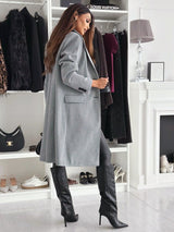 Genießen Sie kuschelige Wärme und zeitlosen Stil mit diesem knielangen Mantel. Seine taillierte Passform definiert sanft Ihre Silhouette, während das weiche Polyestergewebe Sie an kühlen Tagen komfortabel hält. Erhältlich in vielseitigen Farbtönen wie Khaki, Braun, Schwarz und Grau, lässt er sich mühelos sowohl mit Business- als auch mit Wochenendoutfits kombinieren. Der raffinierte Reverskragen und der elegante Knopfverschluss verleihen eine gepflegte Note, ideal zum Schichten mit Schals und Stiefeln.
