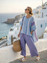 Dieser lässige Retro-Zweiteiler für Damen vereint Komfort und Stil in einem markanten Look. Das Set besteht aus einem gestreiften Oversize-Halbarm-Top und einer locker geschnittenen Hose mit auffälligen Patchwork-Taschen. Ideal für entspannte Urlaubstage, Strandspaziergänge oder kreative Freizeit-Outfits.