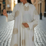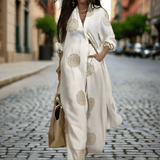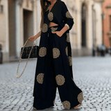 Entdecke dieses stylishe zweiteilige Set mit einem leichten, langem Mantel mit V-Ausschnitt, kombiniert mit hoch taillierten, weit geschnittenen Hosen in einem auffälligen Muster. Perfekt für Anlässe vom Brunch bis zum Abend – es vereint einen eleganten Look mit angenehmem Tragekomfort dank eines weichen Polyester-Mischgewebes. Vielseitig und schmeichelhaft, können die einzelnen Teile zusammen oder getrennt getragen werden, um mehrere schicke Outfits zu kreieren, die auffallen.