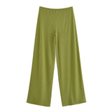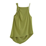 Dieses zweiteilige Set kombiniert ein asymmetrisches, ärmelloses Oberteil mit zartem Faltendetail und Rückenausschnitt mit fließenden, weit geschnittenen Hosen. Die elastische Taille sorgt für bequemen Sitz, während der weite Beinverlauf sanft fällt und eine luftige Silhouette schafft.
